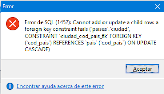 Como puden ver queridos lectores el error es el mismo, ¿porque?, porque si yo cambio el código del país, quedarían ciudades que no enlazan con ningún país, creando errores de integridad, pero ¿Cual sería la solución, pues sencillo, tenemos que indicarle a MySQL (MariaDB), que queremos que nos actualice en cascada en la tabla ciudad, para ello tenemos primeramente que eliminar la llave foránea momentáneamente, para eso tenemos que saber el nombre de la llave foránea, mismo que nos da el mensaje de error 'ciudad_cod_pais_fk', para borrar la llave foránea ejecutaremos la siguiente sentencia